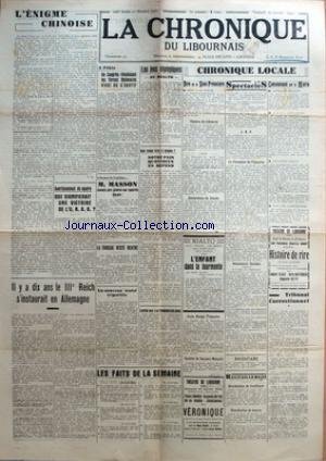 L'ENIGME CHINOISE - A PEKIN - UN CONGRES REUNISSANT LES FORCES NATIONALES VIENT DE S'OUVRIR - M. MASSON - AVERTISSEMENT DE NEUTRE - QUE SIGNIFIRAIT UNE VICTOIRE DE L'U.R.S.S. - IL Y A 10 ANS LE 3EME REICH S'INSTAURAIT EN ALLEMAGNE - UN NOUVEAU TRAITE TRIPARTITE - LA TURQUIE RESTE NEUTRE - LA TUBERCULOSE - LES JEUX OLYMPIQUES AU RIALTO .